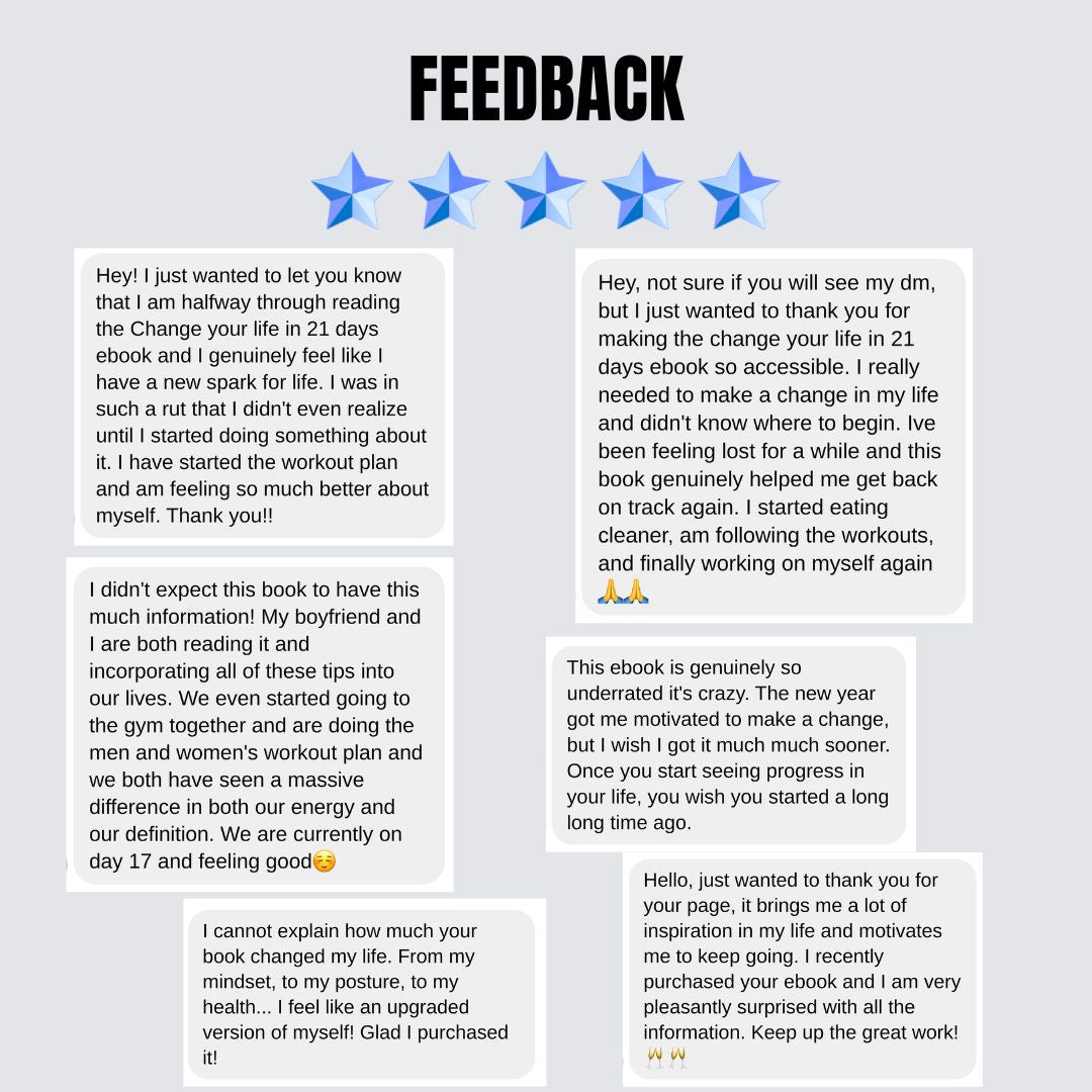 MMasieVerified BuyerI knew I wanted to get my shit together but I honestly didn't know where to start. Mentors are so expensive and I felt lost finding information myself. I happened to see this ad on instagram and decided to make a purchase so that I can start off 2026 in a good direction. I am really glad I did because I have made so many positive changes in my life. For example: I finished the 21 day workout plan and feel stronger than ever. I started the posture exercises because I work from home and my posture needed improvement (definitely improving but its a long process). I started taking pictures of the meals I make to keep myself accountable and even tried one of the recipes in the book (really easy to make!). I started taking care of my appearance more (when you work from home you start dressing comfy and stop wearing so much makeup and it made me just feel lazy in general). I am also interested in learning how to make money online so I think Im going to start affiliate marketing because I love posting the things I buy on tiktok and ig. To sum it up, Im really happy about this purchase and would absolutely recommend it to anyone who is on the fence.Change Your Life in 21 Days - Ebook Was this helpful? 0 0